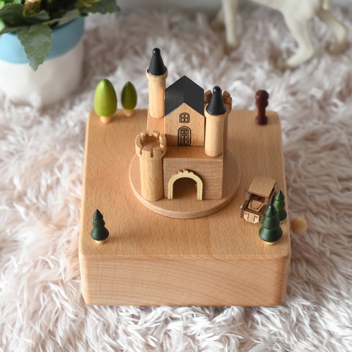 Elk detail van de Muziekdoos Kasteel, gesneden uit ruw hout, is een eerbetoon aan verfijning en charme. De fijne torentjes en zorgvuldig uitgewerkte raampjes benadrukken haar elegante uitstraling die elke speelruimte of kinderkamer verfraait.